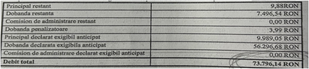 Inițial părțile contractante s-au înțeles ca pentru suma împrumutată, în cuantum de 10.000,00 Lei, să se restituie 75.001,00 Lei, în mod eșalonat, până la împlinirea celor 60 de luni stipulate. Cu fiecare obligație de plată îndeplinită aceasta s-a modificat și a ajuns la cuantumul de 73.796,14 Lei.