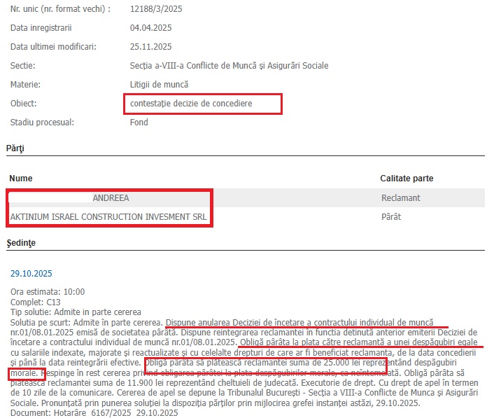 Solutia pe scurt: Admite în parte cererea. Dispune anularea Deciziei de încetare a contractului individual de muncă nr.01/08.01.2025 emisă de societatea pârâtă. Dispune reintegrarea reclamantei în functia detinută anterior emiterii Deciziei de încetare a contractului individual de muncă nr.01/08.01.2025. Obligă pârâta la plata către reclamantă a unei despăgubiri egale cu salariile indexate, majorate şi reactualizate şi cu celelalte drepturi de care ar fi beneficiat reclamanta, de la data concedierii şi până la data reintegrării efective. Obligă pârâta să plătească reclamantei suma de 25.000 lei reprezentând despăgubiri morale. Respinge în rest cererea privind obligarea pârâtei la plata despăgubirilor morale, ca neîntemeiată. Obligă pârâta să plătească reclamantei suma de 11.900 lei reprezentând cheltuieli de judecată. Executorie de drept. Cu drept de apel în termen de 10 zile de la comunicare. Cererea de apel se depune la Tribunalul Bucureşti – Secţia a VIII-a Conflicte de Munca şi Asigurări Sociale. Pronunţată prin punerea soluţiei la dispoziţia părţilor prin mijlocirea grefei instanţei astăzi, 29.10.2025.