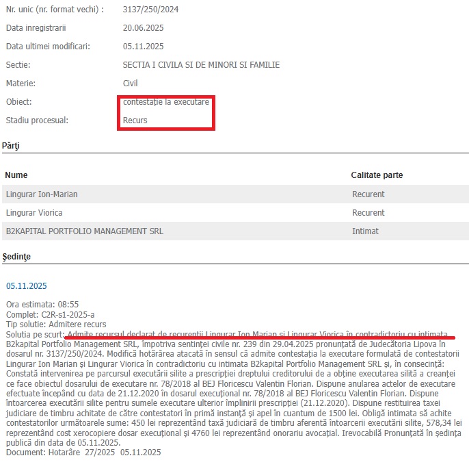Solutia pe scurt: Admite recursul declarat de recurenţii Lingurar Ion Marian şi Lingurar Viorica în contradictoriu cu intimata B2kapital Portfolio Management SRL, împotriva sentinţei civile nr. 239 din 29.04.2025 pronunţată de Judecătoria Lipova în dosarul nr. 3137/250/2024. Modifică hotărârea atacată în sensul că admite contestaţia la executare formulată de contestatorii Lingurar Ion Marian şi Lingurar Viorica în contradictoriu cu intimata B2kapital Portfolio Management SRL şi, în consecinţă: Constată intervenirea pe parcursul executării silite a prescripţiei dreptului creditorului de a obţine executarea silită a creanţei ce face obiectul dosarului de executare nr. 78/2018 al BEJ Floricescu Valentin Florian. Dispune anularea actelor de executare efectuate începând cu data de 21.12.2020 în dosarul execuţional nr. 78/2018 al BEJ Floricescu Valentin Florian. Dispune întoarcerea executării silite pentru sumele executare ulterior împlinirii prescripţiei (21.12.2020). Dispune restituirea taxei judiciare de timbru achitate de către contestatori în primă instanţă şi apel în cuantum de 1500 lei. Obligă intimata să achite contestatorilor următoarele sume: 450 lei reprezentând taxă judiciară de timbru aferentă întoarcerii executării silite, 578,34 lei reprezentând cost xerocopiere dosar execuţional şi 4760 lei reprezentând onorariu avocaţial. Irevocabilă Pronunţată în şedinţa publică din data de 05.11.2025.