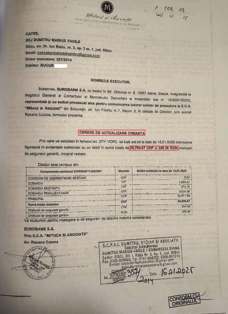 În ianuarie 2025, creditorul a cerut executorului care instrumenta dosarul de executare să actualizeze creanța cu debitul de 58,784.67 CHF și 328.36 RON, deși din 2014, până în 2025, nu au existat acte de întrerupere sau de suspendare.