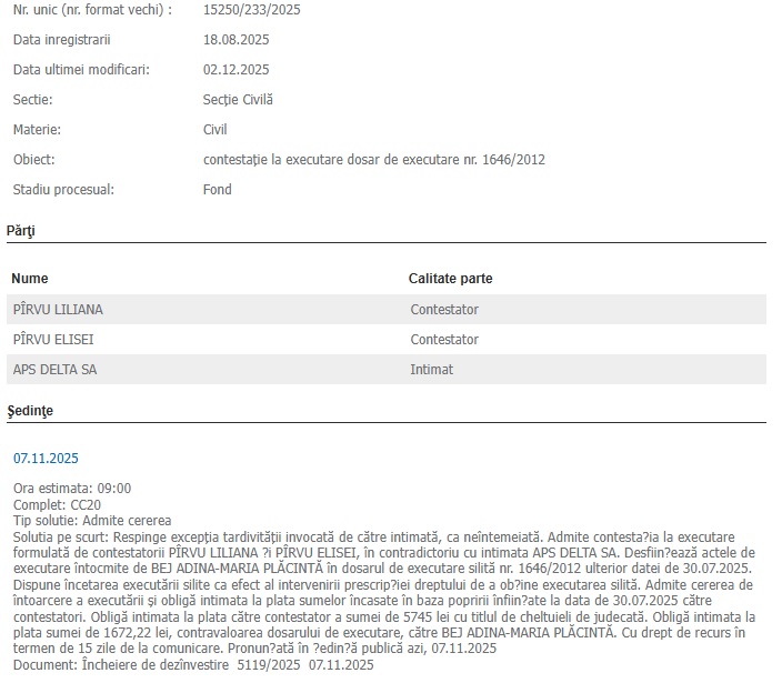Solutia pe scurt: Respinge excepţia tardivităţii invocată de către intimată, ca neîntemeiată. Admite contesta?ia la executare formulată de contestatorii PÎRVU LILIANA ?i PÎRVU ELISEI, în contradictoriu cu intimata APS DELTA SA. Desfiin?ează actele de executare întocmite de BEJ ADINA-MARIA PLĂCINTĂ în dosarul de executare silită nr. 1646/2012 ulterior datei de 30.07.2025. Dispune încetarea executării silite ca efect al intervenirii prescrip?iei dreptului de a ob?ine executarea silită. Admite cererea de întoarcere a executării şi obligă intimata la plata sumelor încasate în baza popririi înfiin?ate la data de 30.07.2025 către contestatori. Obligă intimata la plata către contestator a sumei de 5745 lei cu titlul de cheltuieli de judecată. Obligă intimata la plata sumei de 1672,22 lei, contravaloarea dosarului de executare, către BEJ ADINA-MARIA PLĂCINTĂ. Cu drept de recurs în termen de 15 zile de la comunicare. Pronun?ată în ?edin?ă publică azi, 07.11.2025