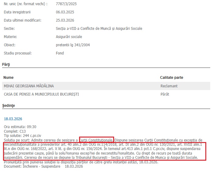 | 18.03.2026 Ora estimata: 09:30 Complet: C13 Tip solutie: 244 c.pr.civ Solutia pe scurt: Admite cererea de sesizare a Curţii Constituţionale. Dispune sesizarea Curţii Constituţionale cu excepţia de neconstituţionalitate a prevederilor art. 40 alin.2 din OUG nr.114/2018, art. IX alin.2 din OUG nr. 130/2021, art. XVIII alin.1 lit.n din OUG nr. 168/2022, art. X lit. g din OUG nr. 156/2024. În temeiul art.413 alin.1 pct.1 C.pr.civ, dispune suspendarea judecării prezentei cauze, până la solu?ionarea excep?iei de neconstitu?ionalitate. Cu drept de recurs pe toată durata suspendării. Cererea de recurs se depune la Tribunalul Bucureşti – Secţia a VIII-a Conflicte de Munca şi Asigurări Sociale. Pronunţată prin punerea soluţiei la dispoziţia părţilor de către grefa instanţei astăzi, 18.03.2026. Document: Încheiere – Suspendare 18.03.2026 |